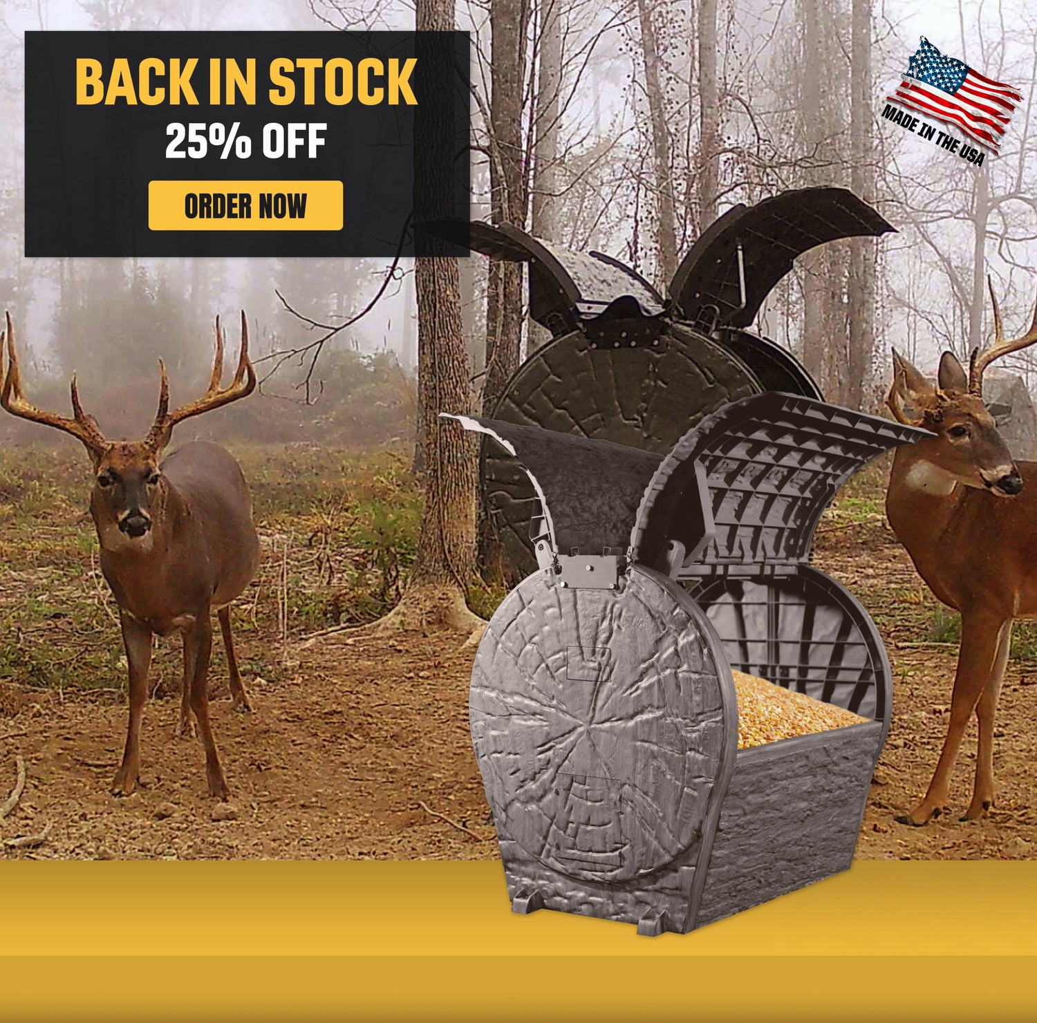 Our deer feeder invention holds 350 pounds of dry feed and is rain and weather-resistant, allowing you to hunt in any condition and saving you money on feed.